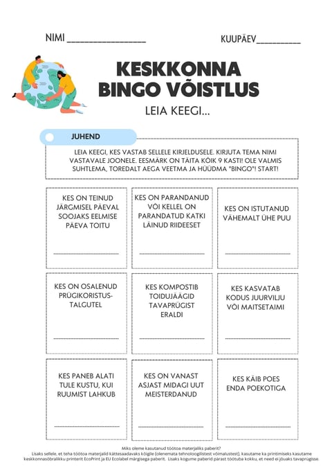 Keskkonnateemaline bingo on koostatud eesmärgiga tutvustada noortele, mida keskkonnasõbralikku saavad nemad ise kodus teha. Bingo mängu kaudu õpivad osalejad tundma ringmajanduse põhimõtteid.